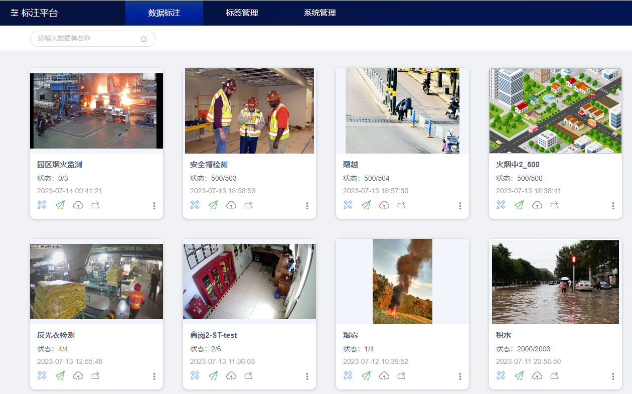 数据管理界面对推送过来的已完成标注的数据集按照一定比例自动分配训练数据和测试数据,然后在模型管理界面选择训练适配显卡,提交训练。