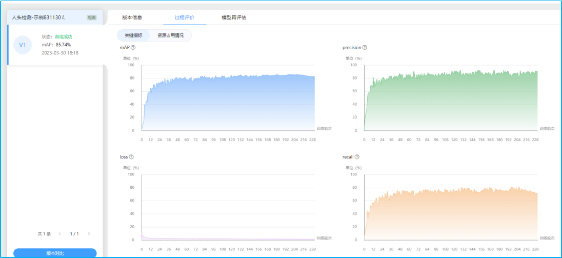 模型管理界面可查看训练在成功的模型的版本信息,如工作流的完成情况,模型训练时长,通过模型过程评价和模型再评估可查看模型的关键指标如准确率、召回率等。