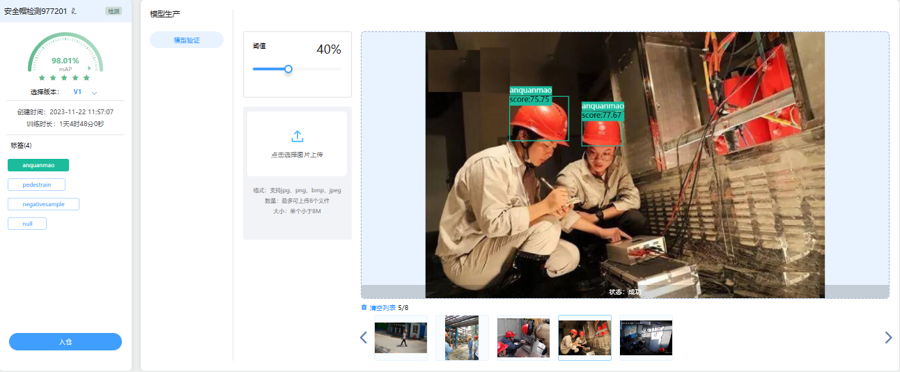 模型管理界面选择模型验证,可以选择上传验证的图片数据,对训练成功的模型进行效果验证,确认是否能够识别检出目标。
