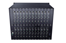 (4)标准工业式机箱,1U机箱可装配2个模块,2U机箱最多6个模块,4U机箱最多12个模块,8U可实现24模块,根据客户的需求,可定制12U、16U等更大机型插入更多模块,且多机可级联。
